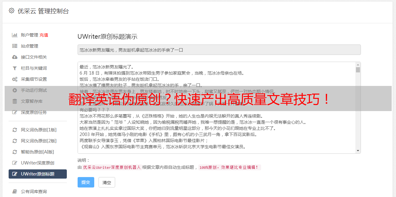 翻译英语伪原创技术是一种快速产出高质量文章的有效方法,但是在使用时也需要注意一些问题。希望本文能够对自媒体从业者有所启发,同时也欢迎大家了解更多关于优采云和SEO优化的信息,请访问优采云官网www.ucaiyun.com。