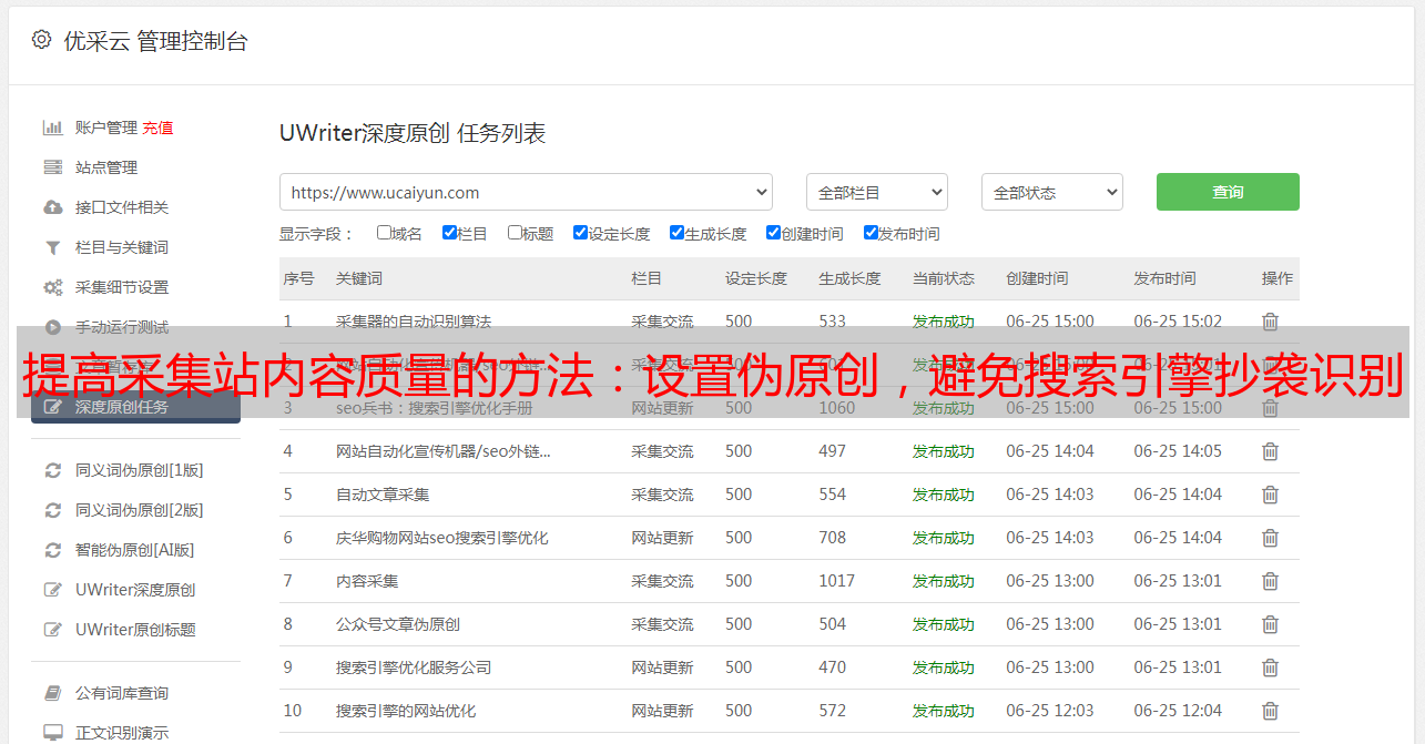 优采云 发布时间: 2023-04-04 19:15采集站作为一种网络信息的采集工具,在互联网信息化的时代,已经成为了各行业信息获取的必备工具之一。但是,对于采集站来说,如何保证其采集的内容不被搜索引擎识别为抄袭,从而避免被封杀、降权等问题呢?这就需要利用伪原创技术。