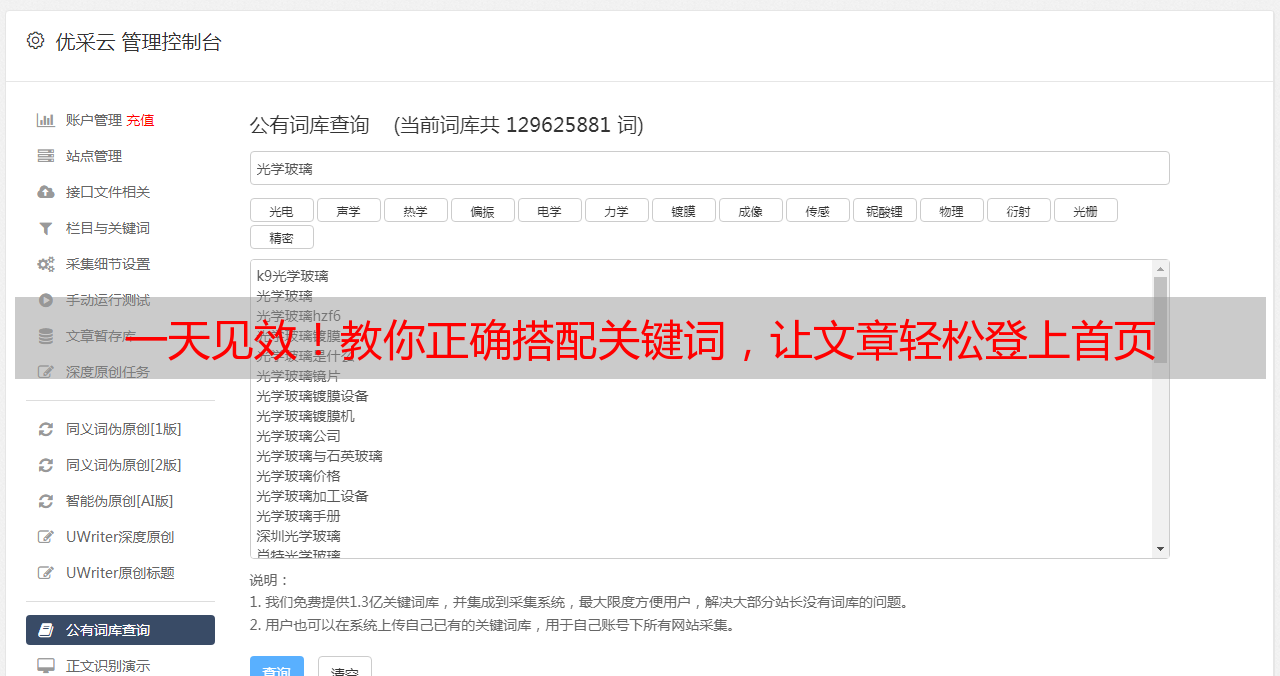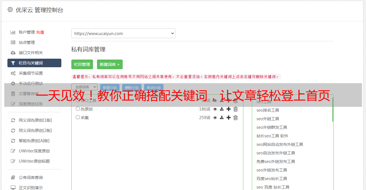 优采云是一家专业的SEO优化工具提供商,可以帮助自媒体人轻松实现关键词搭配、内容分析、链接管理等操作,从而提高文章的排名和曝光率。想要了解更多信息,请访问www.ucaiyun.com。