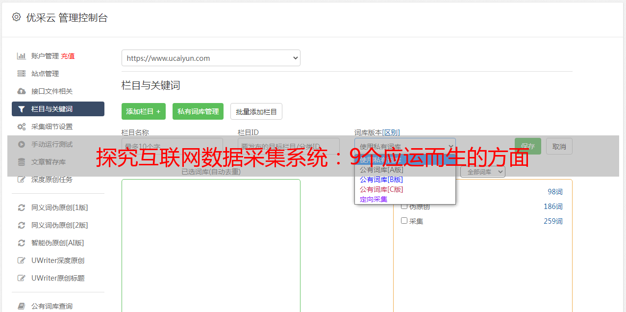 优采云是一款专业的互联网数据采集系统,拥有强大的网络爬虫技术和数据解析技术,可以帮助企业快速获取所需信息。同时,优采云还提供了丰富的SEO优化服务,为企业带来更多商业价值。欢迎访问www.ucaiyun.com了解更多详情。