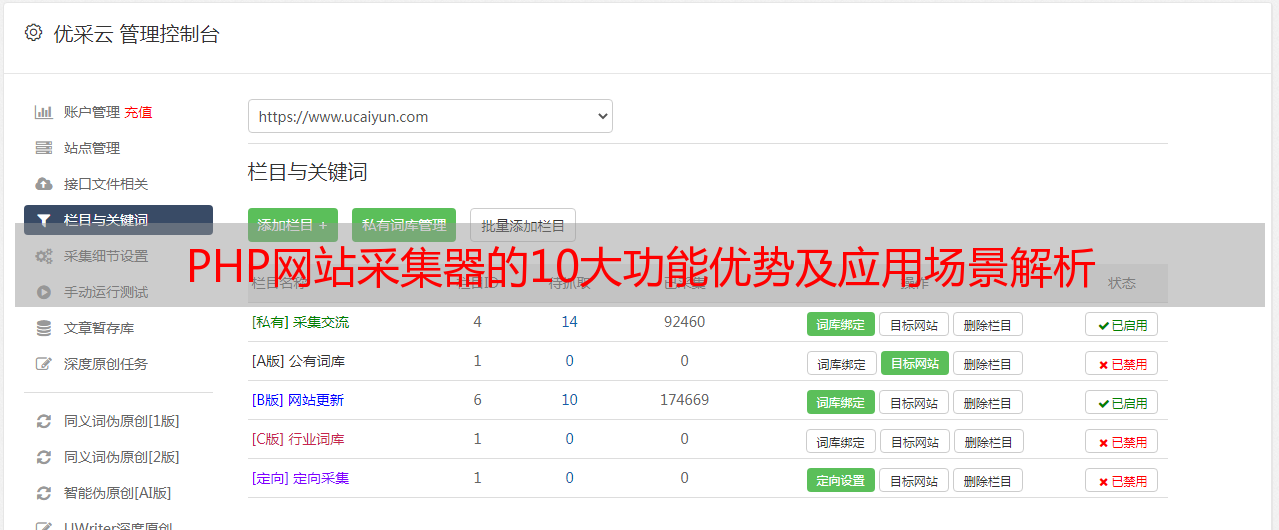 优采云 发布时间: 2023-04-05 07:11在当今信息爆炸的时代,网站采集已成为各行业必不可少的一个环节。对于需要大量数据支撑的企业或个人而言,手动复制、粘贴数据显然是一件低效、耗时的工作。这时,一款高效、简单易用的PHP网站采集器就显得尤为重要。本文将从10个方面详细分析PHP网站采集器的功能、优势及应用场景,帮助读者更好地了解和使用该工具。