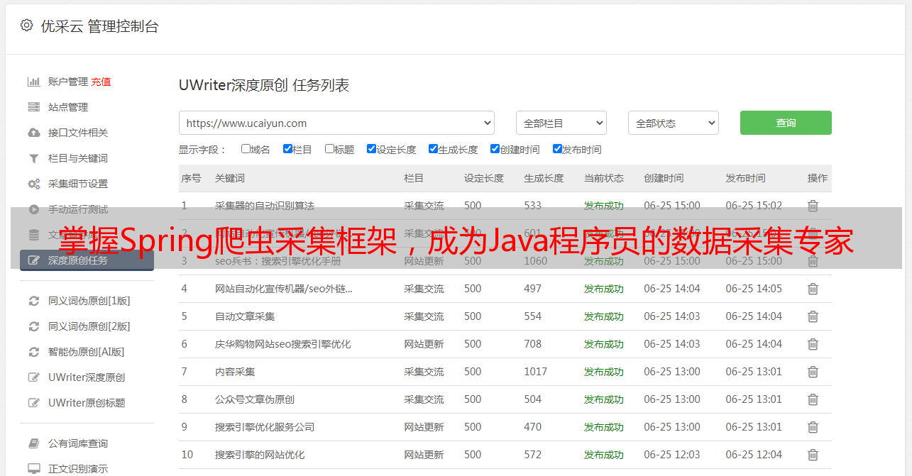 Spring爬虫采集框架作为一款高效、灵活、易用的Java爬虫框架,具备良好的可扩展性和可维护性,适用于各种规模的爬虫项目。在使用过程中需要遵守相关法律法规,并注意网站的反爬机制,同时也需要对采集到的数据进行去重、清洗等处理,确保数据的准确性和完整性。优采云提供了全面的SEO优化服务,为您的网站带来更多流量和收益,欢迎访问www.ucaiyun.com了解更多信息。