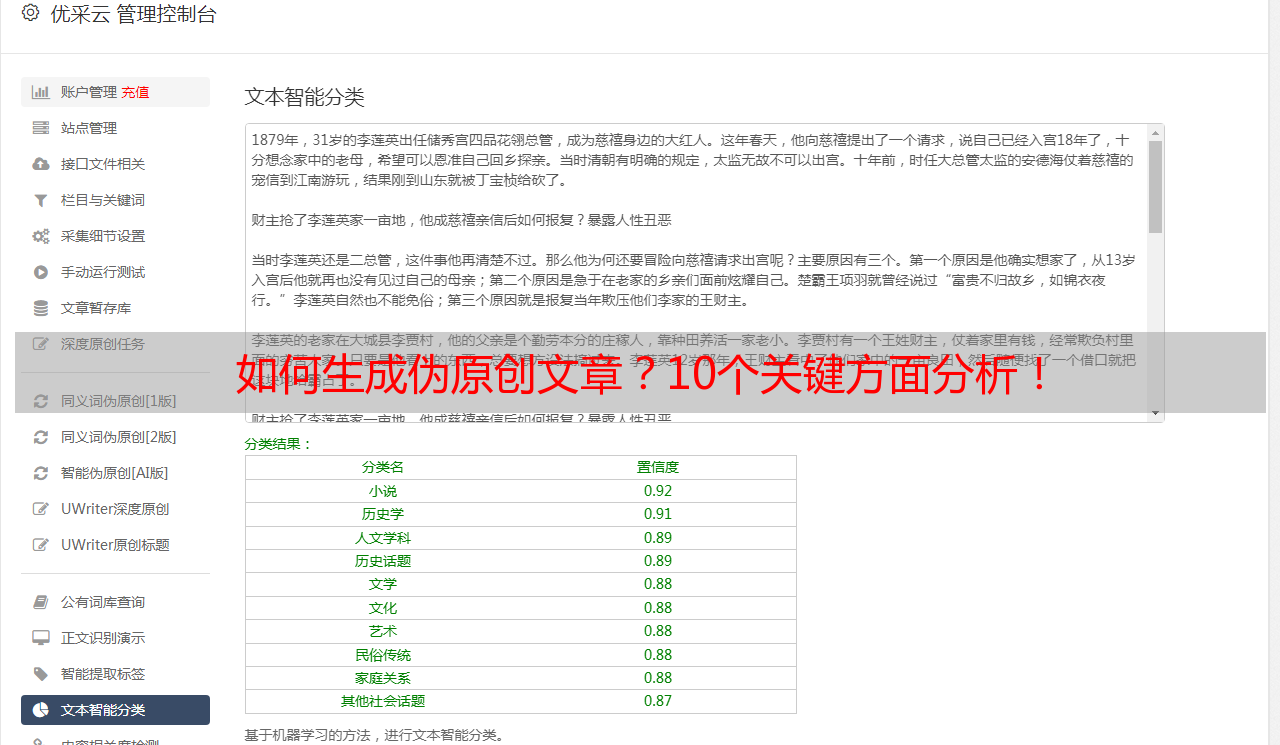 总之,伪原创文章的生成需要技术和经验的积累,只有不断实践和探索,才能写出更加优质的伪原创文章。优采云为您提供一站式SEO优化方案,让您的自媒体更具吸引力!详情请访问www.ucaiyun.com。