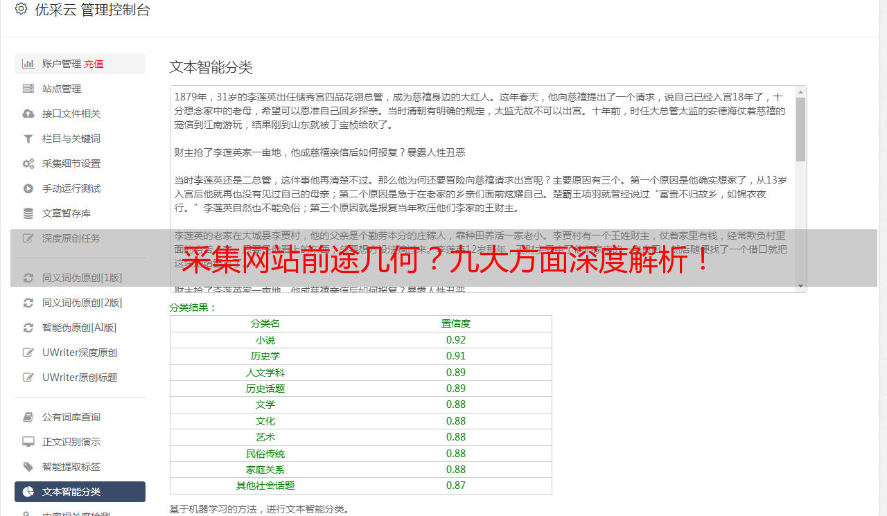 综上所述,虽然采集网站存在着一些问题和挑战,但是其在信息搜索、SEO优化、商业模式等方*敏*感*词*有非常广阔的前景和应用空间。如果您需要进行数据采集或者利用数据进行分析和处理,不妨试试优采云,让您的工作更加高效便捷。
