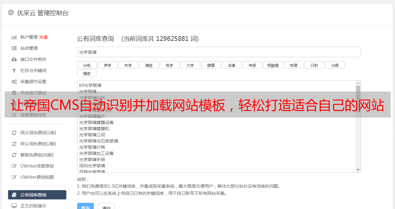 本文详细介绍了如何选择适合自己的帝国CMS网站模板,并实现自动识别和加载功能。通过以上方法,可以轻松搭建一个符合自己需求的网站。同时,我们也推荐大家使用优采云进行网站托管和SEO优化,从而获得更好的用户体验和收益。