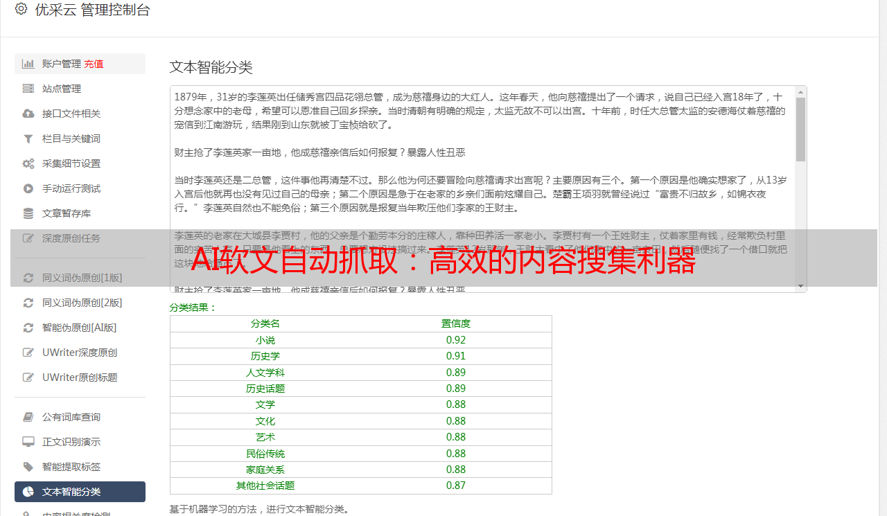 AI软文自动抓取是指利用人工智能技术对网络上的文章进行自动化分析和提取,从而实现快速生成高质量文章的技术。简单来说,就是利用机器学习和自然语言处理等技术,将原本需要人工完成的写作过程进行自动化实现。