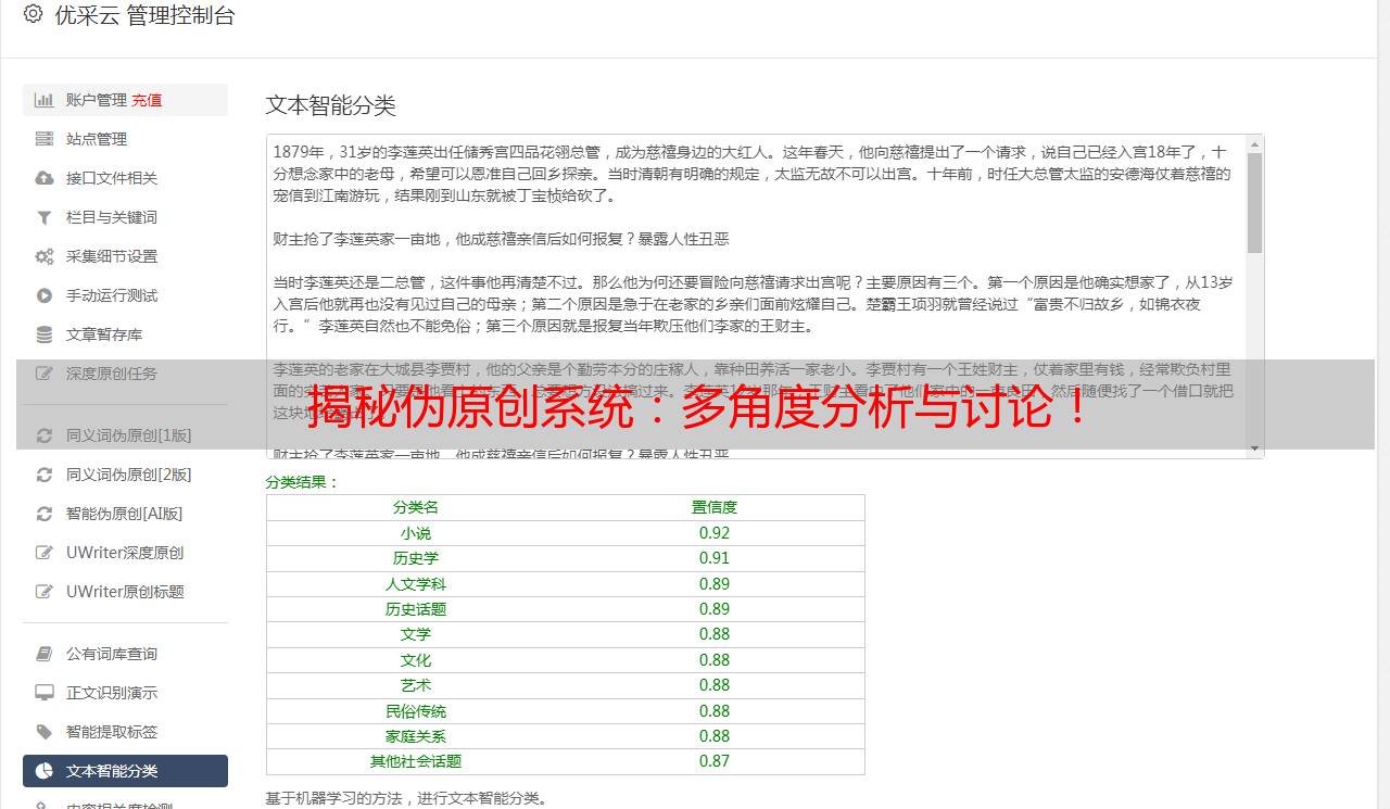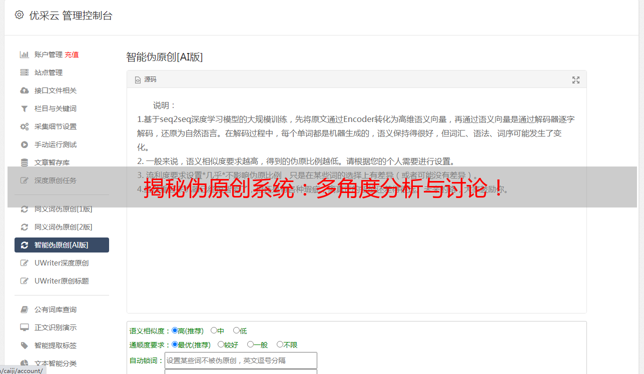 优采云 发布时间: 2023-04-09 05:09伪原创系统是一种通过算法实现的文章自动生成工具,可以在短时间内生成大量的文章,使得内容创作变得更加轻松。但是,伪原创系统也存在一些问题和风险。本文将从多个方面对伪原创系统进行分析和讨论。