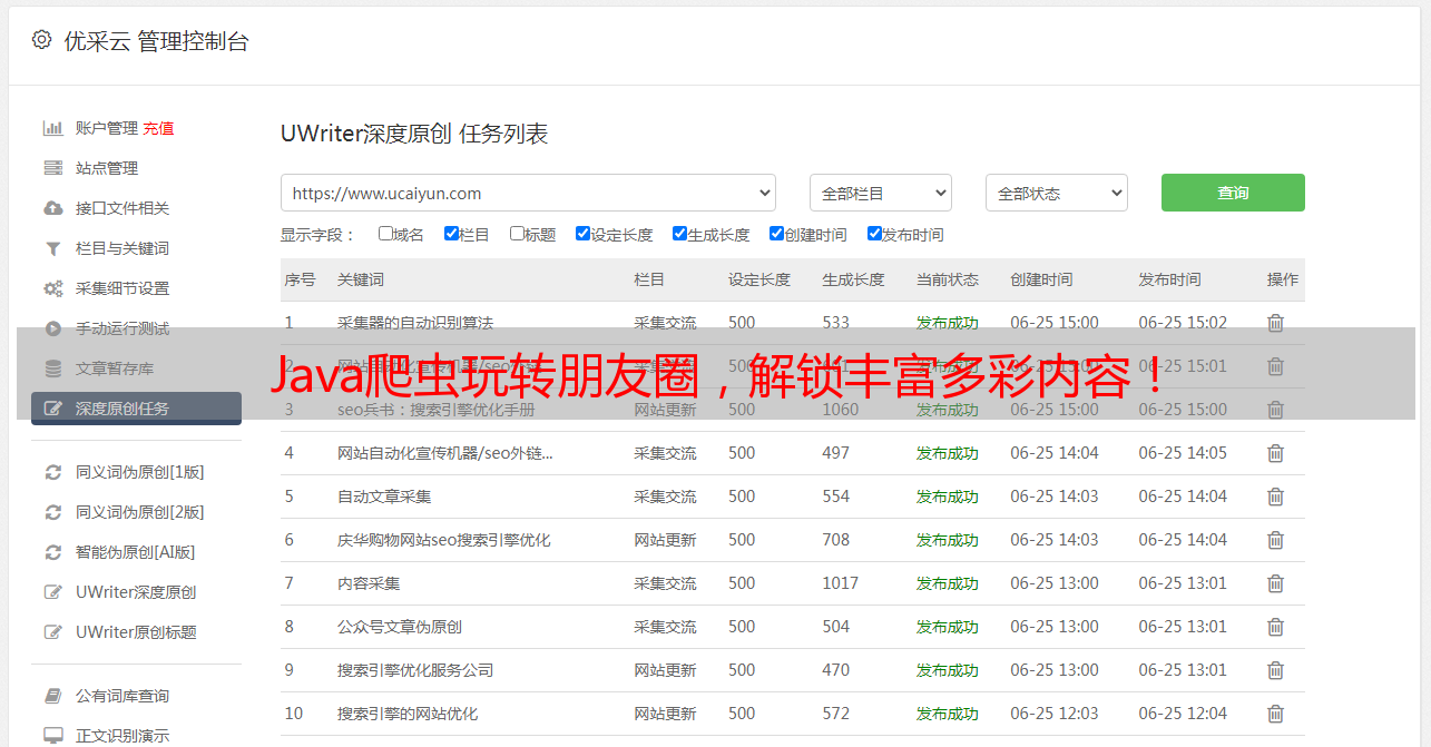 通过使用Java爬虫,我们可以轻松地获取朋友圈中的各种有趣内容,比如朋友们的动态、热门话题等等。当然,在进行任何爬虫活动时,都需要遵守相关法律法规和道德规范。如果你想了解更多关于Java爬虫的知识,可以访问优采云网站(www.ucaiyun.com),了解更多有关SEO优化和网络营销的知识。