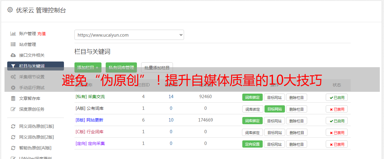 总之,自媒体内容质量是影响文章排名和流量的重要因素之一。创作者应该注重文章质量,避免使用敏感词和伪原创工具,提高阅读体验和关键词密度,不断学习提升自身写作水平。优采云提供的SEO优化工具可以帮助创作者快速检测文章中的敏感词并进行修改。