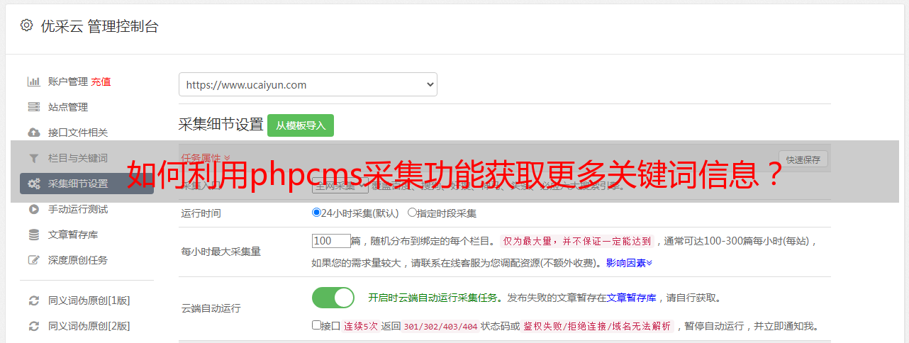 phpcms采集功能是一个非常强大的数据获取工具,它可以帮助网站管理员快速获取到相关数据,并进行二次加工和利用。在使用该功能时,请务必遵守相关法律法规,并注意保护目标网站的权益。同时,我们也推荐您结合其他SEO优化工具一起使用,例如优采云等,来帮助您更好地进行关键词分析和优化。