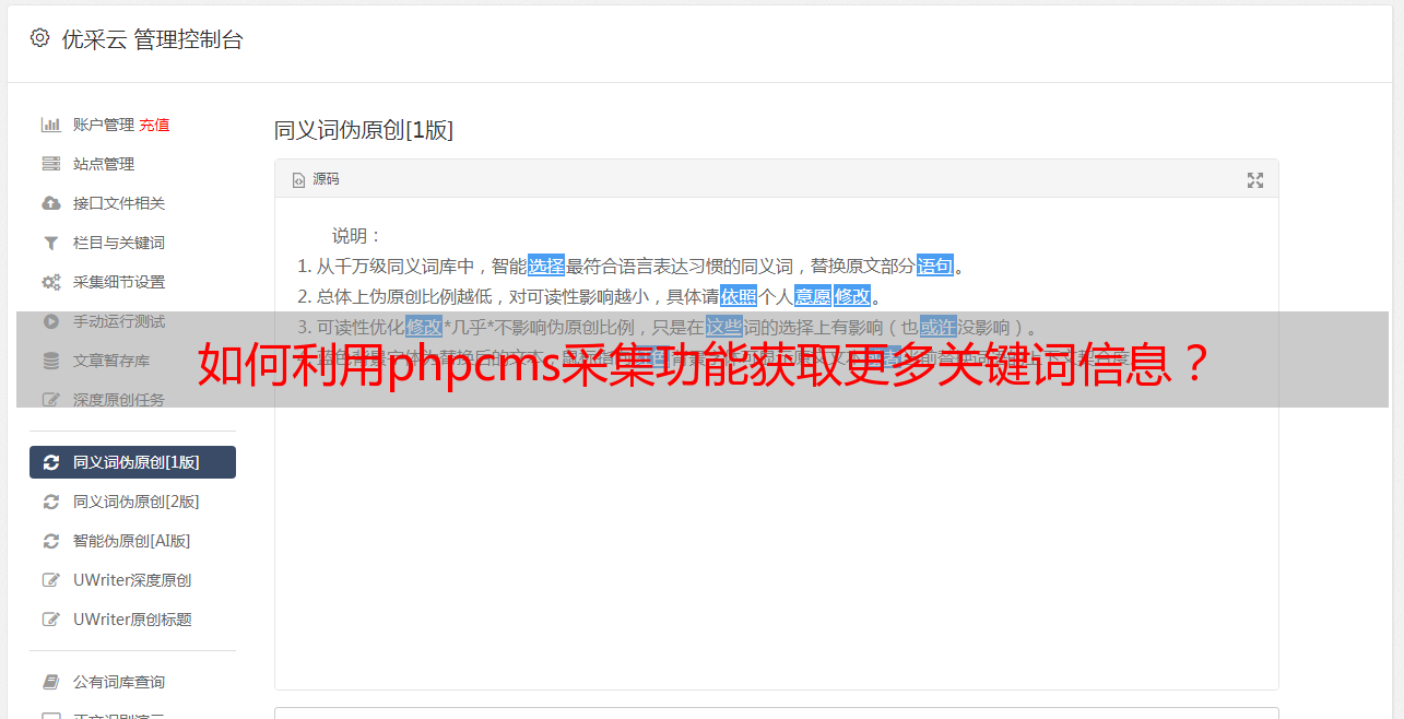 优采云 发布时间: 2023-04-09 15:20如果你是一个懂得SEO优化的网站管理员,那么你一定知道关键词的重要性。而如何获取到相关关键词,就需要使用到phpcms采集功能。phpcms采集功能是phpcms系统中非常强大的一个功能,可以帮助网站管理员快速从各大搜索引擎和网站上获取到相关的关键词信息。本文将为你详细介绍phpcms采集功能,并教你如何使用它来获取更多的关键词信息。