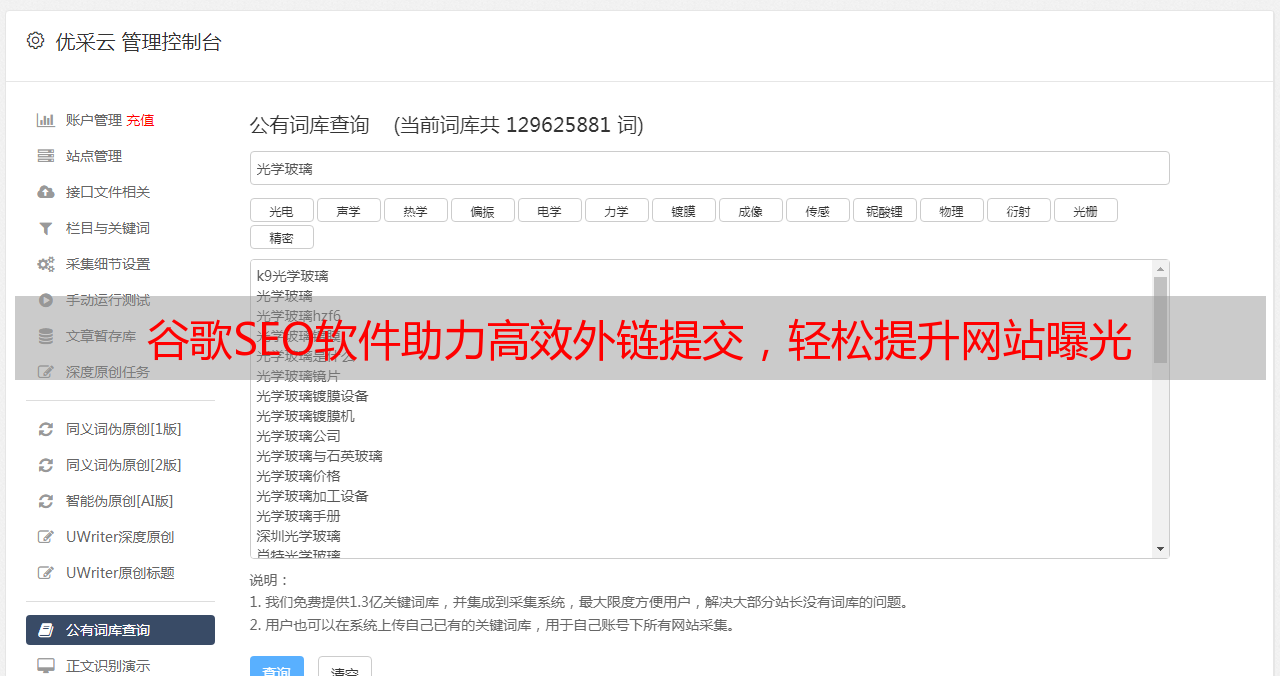 优采云 发布时间: 2023-04-09 15:21众所周知,SEO 优化是提升网站排名的关键。而谷歌作为全球最大的搜索引擎,其排名更是备受关注。在谷歌 SEO 中,外链的重要性不言而喻。但是如何高效地提交外链呢?这时候,谷歌 SEO 软件就派上用场了。