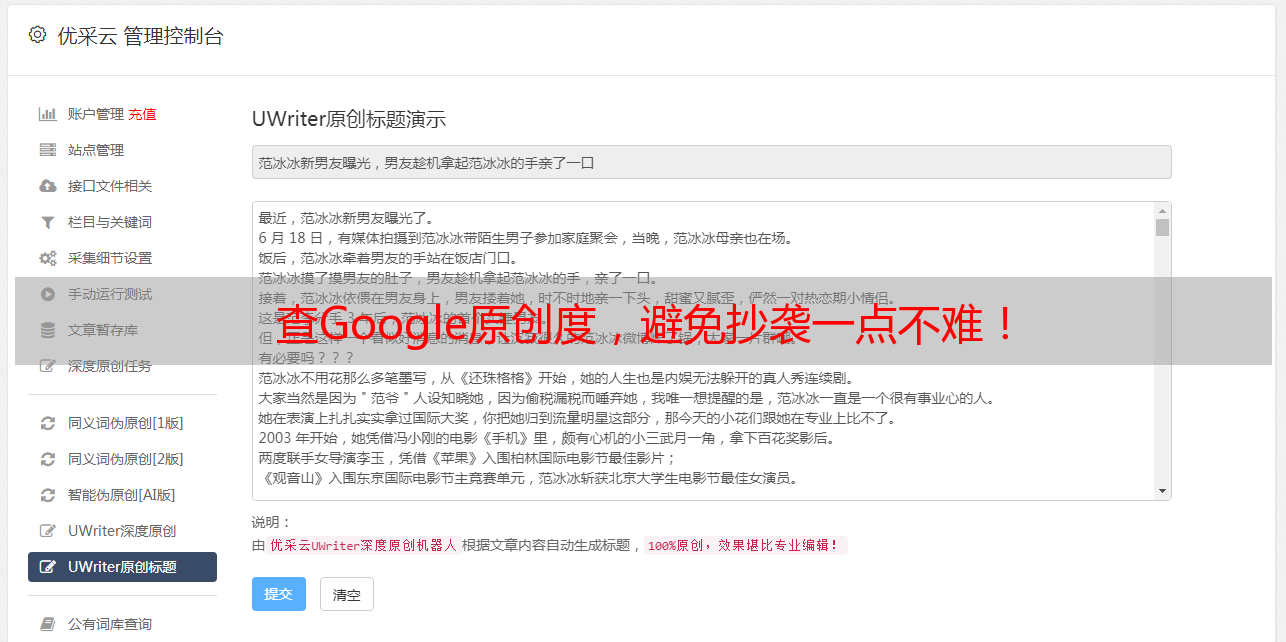 优采云 发布时间: 2023-04-09 15:22众所周知,Google是世界上最大的搜索引擎之一。在写作中,我们常常需要通过Google搜索来获取文献资料和灵感。但是,我们是否了解Google对于文章原创度的检测和评估呢?在这篇文章中,我们将详细分析如何在查找资料时避免被认定为抄袭。