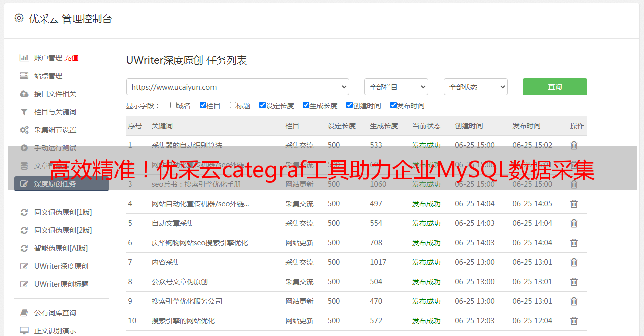 优采云 发布时间: 2023-04-09 16:19随着互联网的不断发展,数据已经成为了企业重要的战略资源,而数据采集作为数据获取的第一步,其重要性不言而喻。对于大多数企业而言,数据采集是一个非常耗时、繁琐的过程。因此,如何提高数据采集效率成为了企业必须面对的问题之一。本文将介绍优采云旗下的categraf采集mysql工具,帮助企业实现高效、精准的数据采集。
