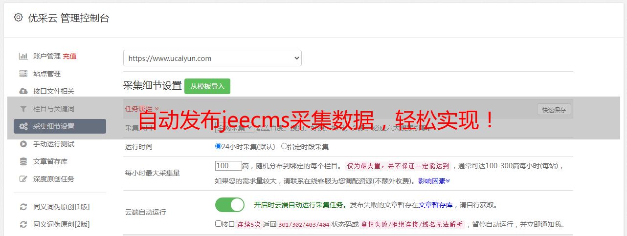 通过以上步骤,我们就可以成功地实现jeecms采集自动发布。在实际操作中,还需要注意数据的正确性和完整性,以及对网站安全的保护等问题。如果您需要更多帮助,可以关注优采云官网(www.ucaiyun.com),获取更多相关信息。