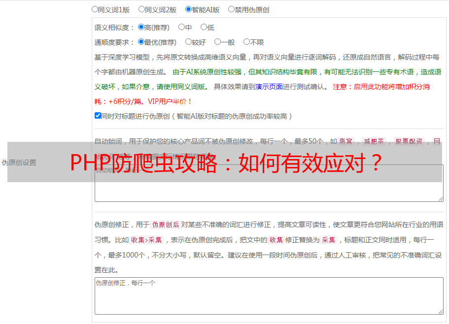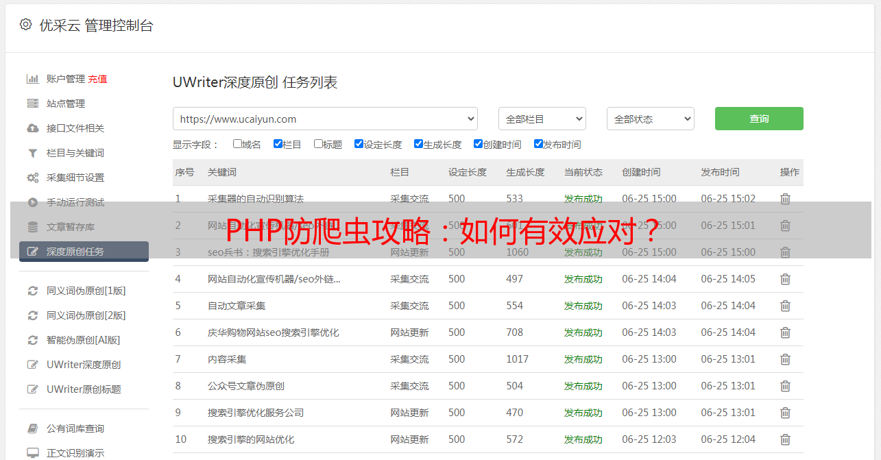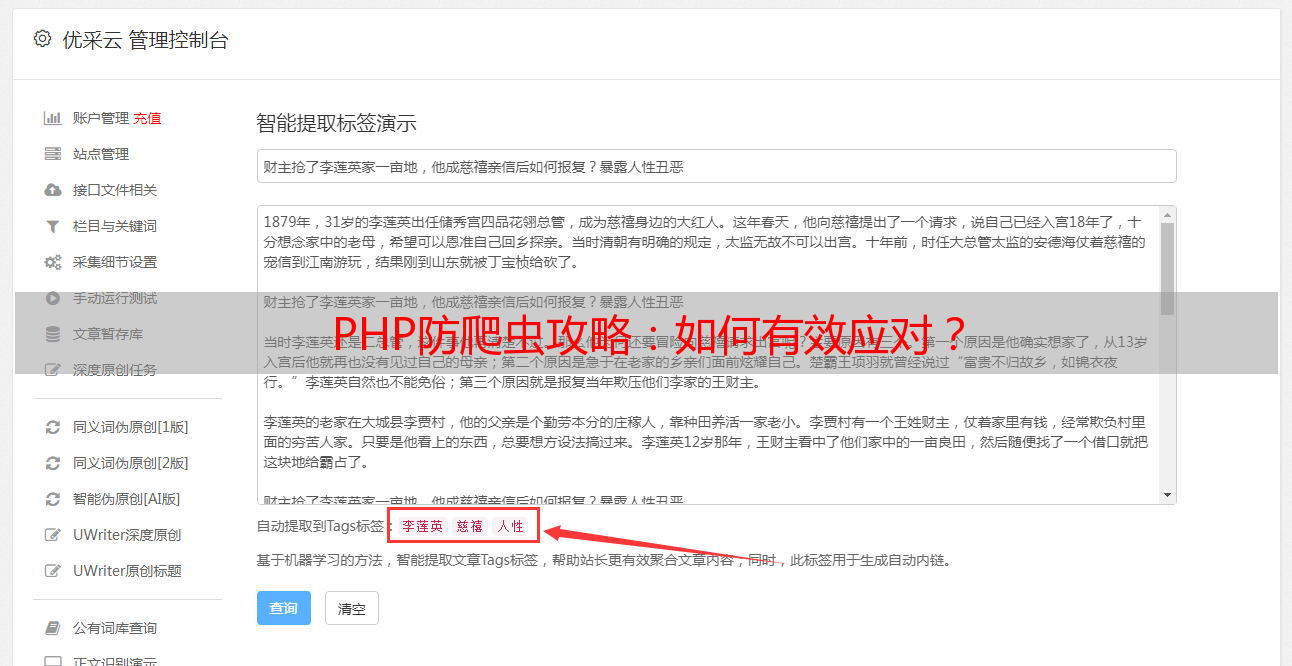 优采云 发布时间: 2023-04-09 23:17在今天的互联网时代,爬虫已经成为了一个非常普遍的现象。为了保护自己的网站和数据,防止被恶意爬取和利用,很多人开始关注如何防止爬虫。PHP作为一种广泛使用的Web开发语言,在防止爬虫方面也有着重要的作用。本文将从原理到实践,详细介绍如何使用PHP防止爬虫。