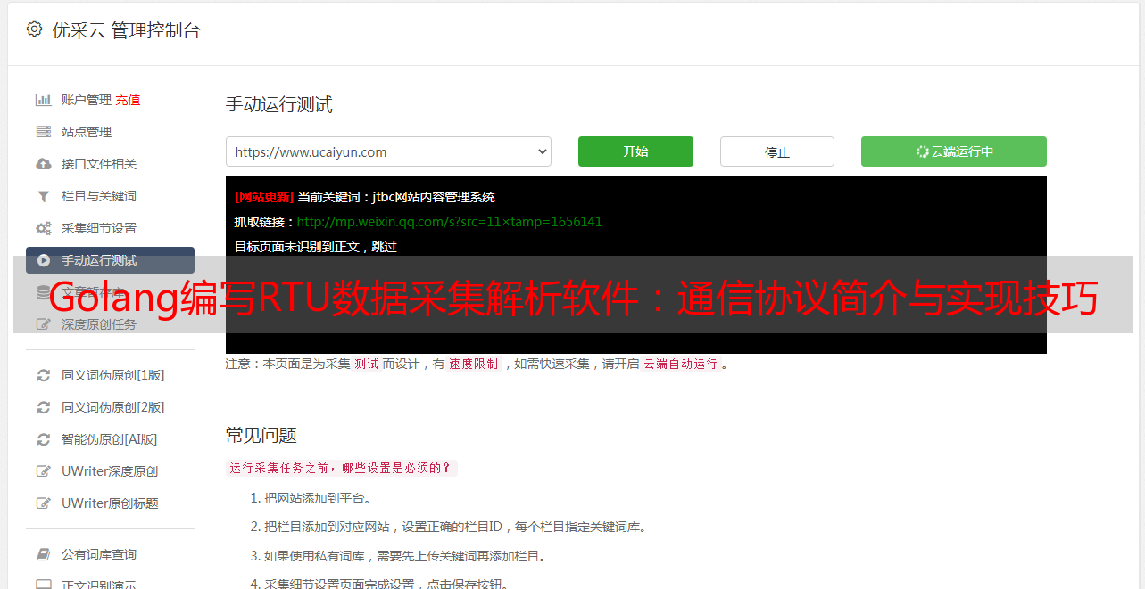 本文介绍了如何使用golang编写rtu数据采集解析软件,并简单介绍了modbus协议和优采云。希望读者能够通过本文的介绍,轻松实现数据采集。