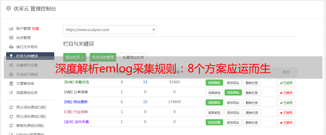 emlog采集规则是优采云平台中的一个功能模块。通过优采云平台,可以轻松设置、管理、监控所需要的采集任务,并实现自动化发布到指定博客系统中。同时,还可以对所爬取数据进行处理分析,方便用户进行数据挖掘和分析。