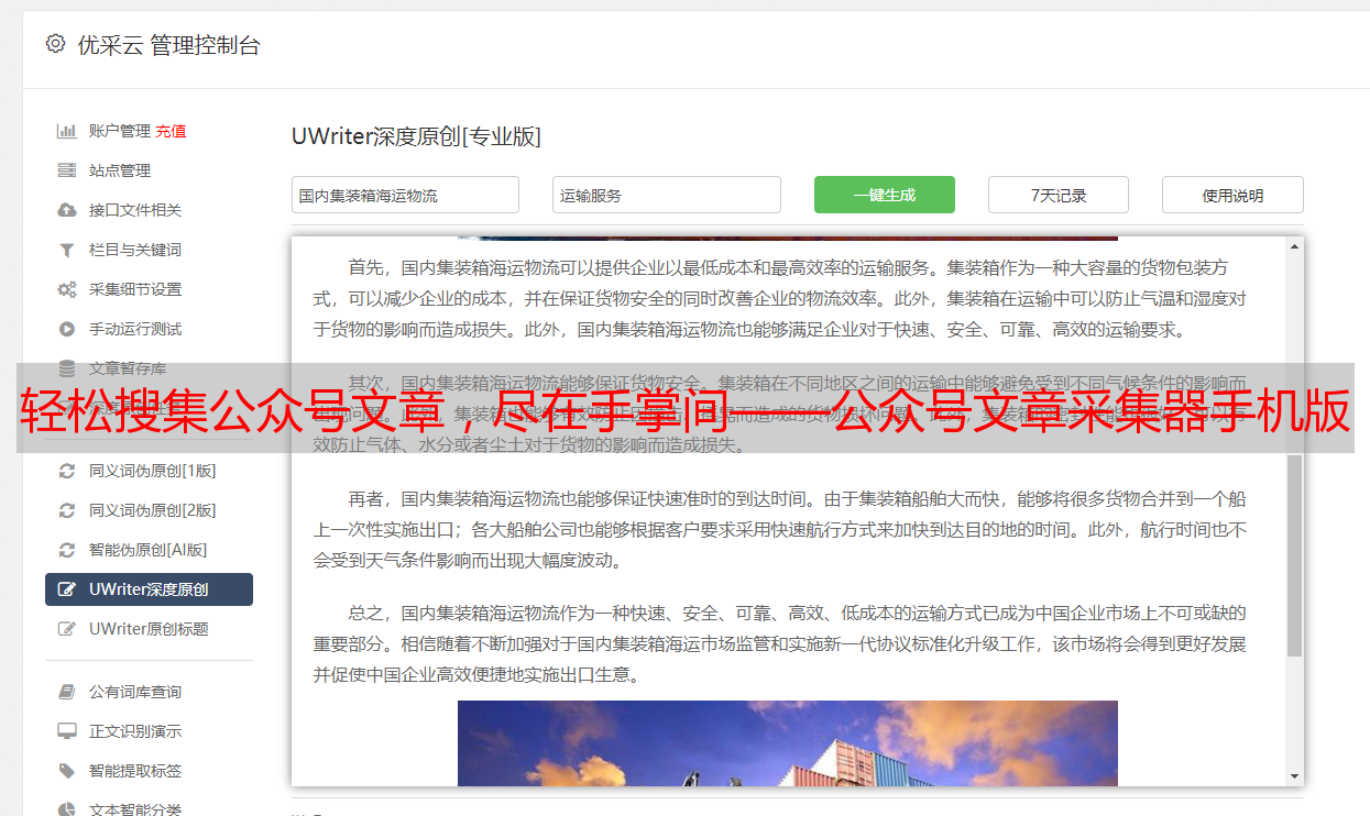 优采云 发布时间: 2023-04-12 11:35在信息时代,人们对于信息的需求越来越高,而公众号成为了许多人获取信息的重要途径。但是,想要找到真正有用的、优质的内容却不是一件容易的事情。那么,有没有一种工具可以帮助我们快速地采集到大量优质内容呢?答案是肯定的——公众号文章采集器手机版。