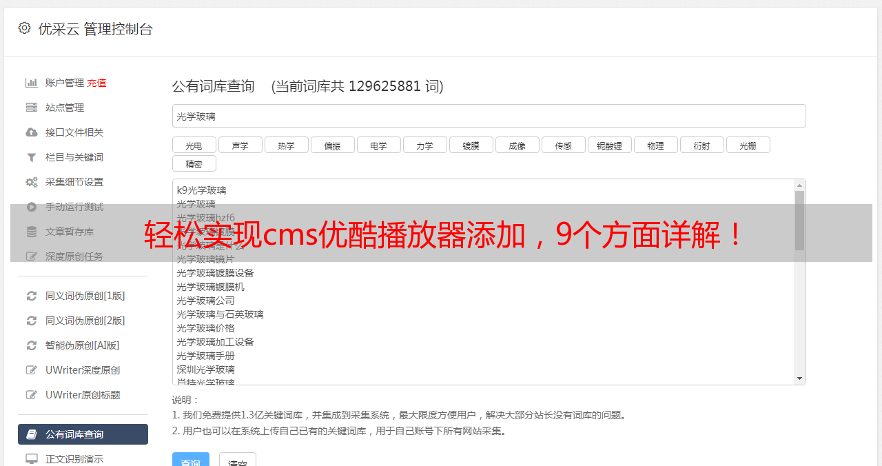 优采云 发布时间: 2023-04-13 10:58在现今的互联网时代,视频已成为人们获取信息、娱乐的主流方式之一。许多网站也开始加入视频播放器,以吸引用户。而优酷作为国内最大的视频分享网站之一,其播放器自然成为了广大网站所青睐的对象。那么如何在cms中添加优酷播放器呢?本文将从以下9个方面进行详细分析。