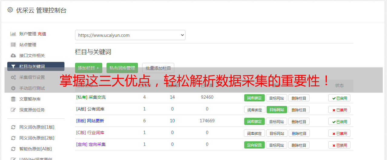 综上所述,数据采集具有提高数据质量、提高工作效率和提高竞争力的三大优点。因此,在现代企业运营中,数据采集已经成为必不可少的一部分。如果您需要更好地了解如何进行数据采集,欢迎访问优采云(www.ucaiyun.com),我们将为您提供专业的数据采集服务和SEO优化建议。