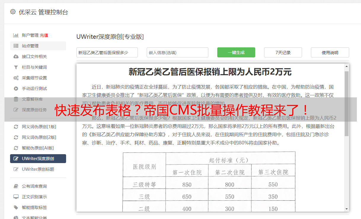 优采云 发布时间: 2023-04-16 22:34在日常网站管理中,表格是一个常见的元素。不论是展示数据还是收集信息,表格都可以提供极大的帮助。但是,手动添加表格的过程往往费时费力,特别是当你需要添加众多表格时更是如此。那么,是否有什么方法可以让我们更轻松地进行批量表格发布呢?答案就是帝国CMS。