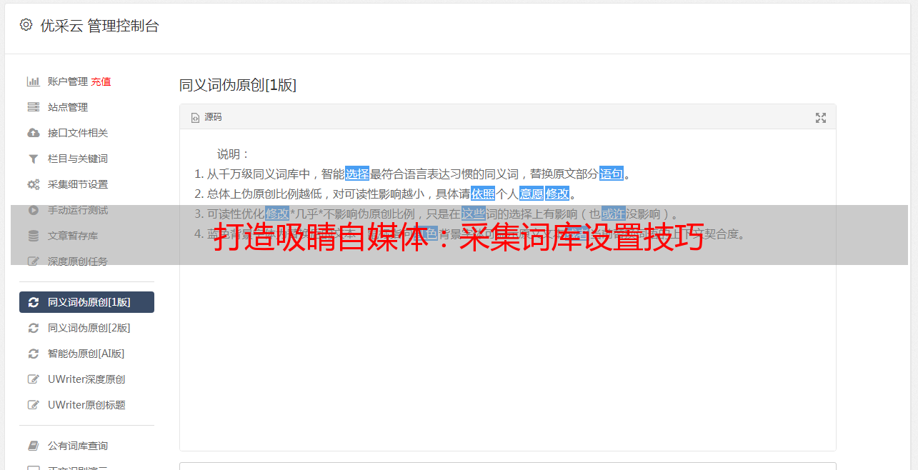 优采云 发布时间: 2023-05-07 09:47在自媒体时代,内容为王已经成为了不争的事实。而作为一名自媒体人,如何打造出优质的内容,吸引更多的读者?其中一个重要的环节就是采集词库设置。本文将从以下10个方面进行详细讲解,帮助你打造出更具吸引力的自媒体内容。