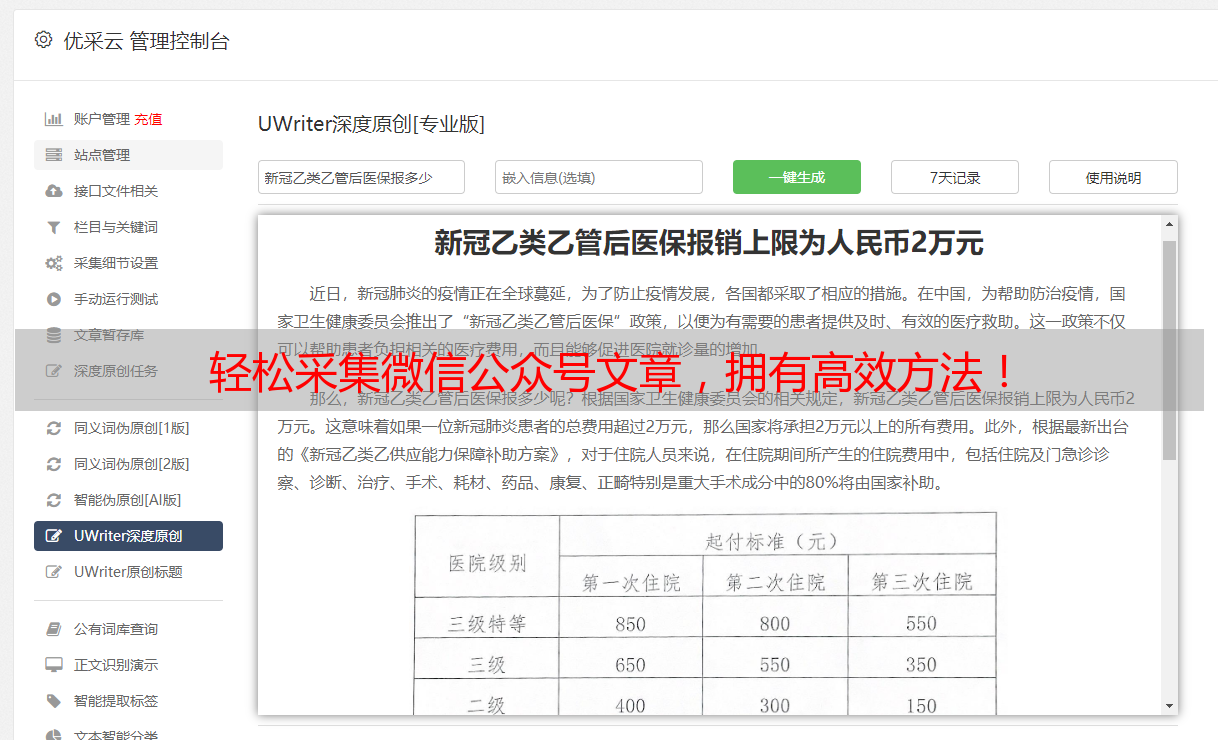 优采云是一款专业的SEO优化工具,除了提供关键词分析、竞品分析等功能外,还提供了微信公众号文章批量采集功能。只需在优采云中输入相关关键词,即可获取到大量与该主题相关的微信公众号文章。