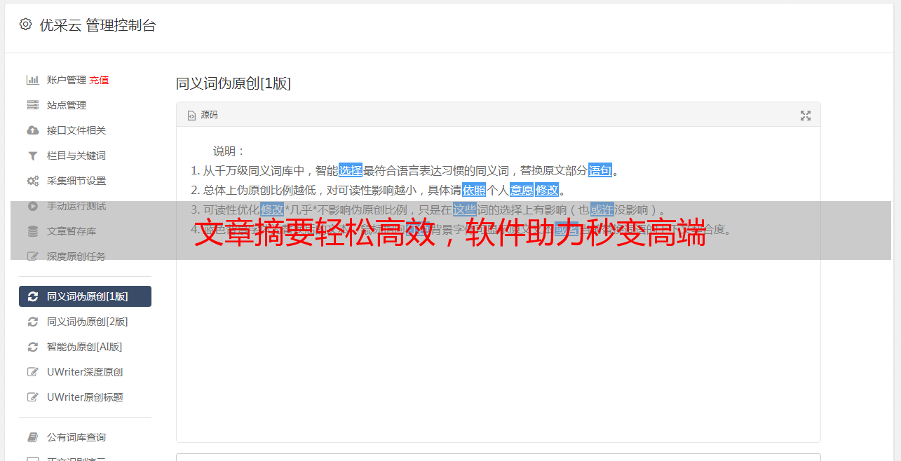 优采云 发布时间: 2023-05-10 02:53在信息爆炸的时代,人们对于获取信息和知识的需求越来越强烈,而文章摘要作为一种快速获取信息的方式已经成为人们日常学习、工作中不可或缺的一部分。本文将为大家介绍一款名叫“智能摘要”的软件,它可以让你的文章摘要秒变高大上,为你节省时间、提高效率,同时也能帮助你更好地进行SEO优化。