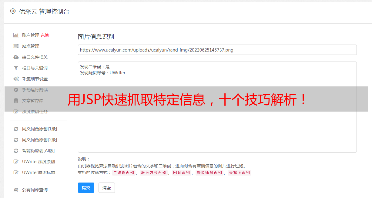 以上就是JSP抓取网页特定信息的十个方面,希望能对你在数据采集中有所帮助。如果你想更加深入地了解数据采集和处理技术,推荐你关注优采云(www.ucaiyun.com)这个专业的数据采集和SEO优化平台。