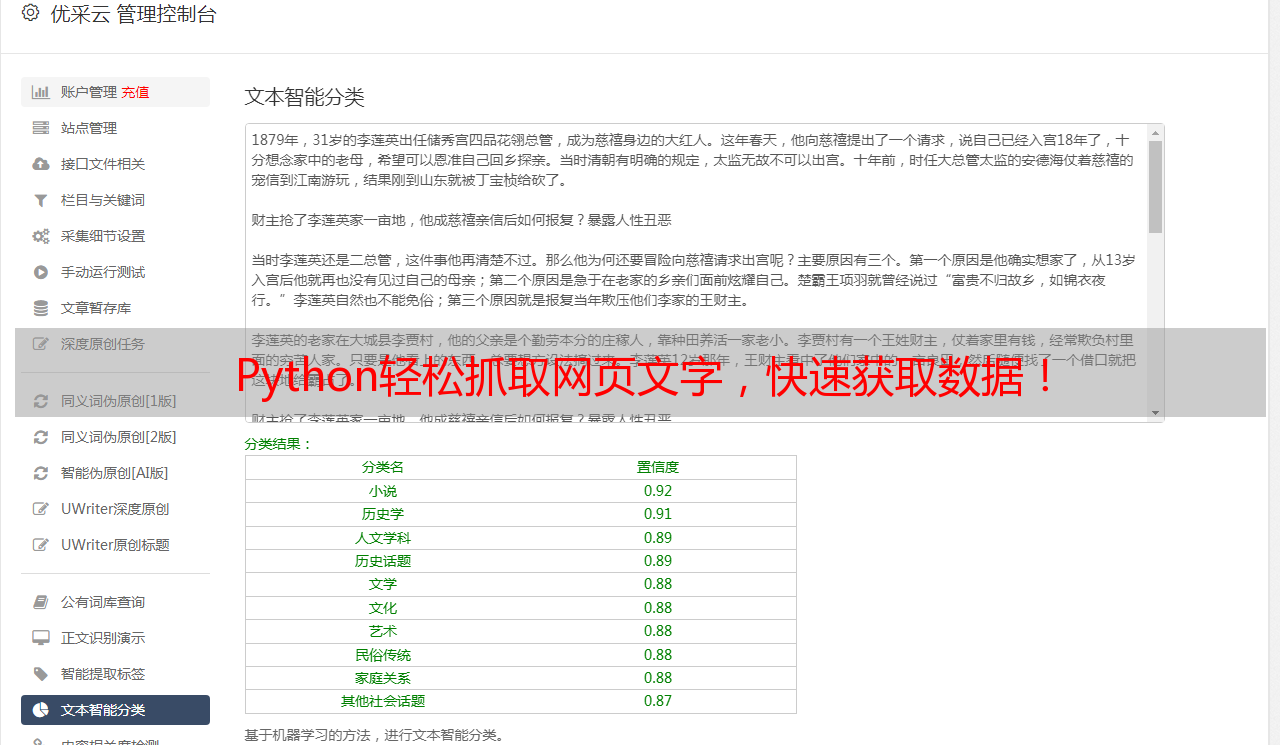 优采云 发布时间: 2023-05-10 06:27在互联网时代,数据是一切的基础。而数据的获取方式也变得越来越多样化,其中抓取网页数据是最为常见的方式之一。本篇文章将介绍如何使用Python来抓取网页里面的文字,让你轻松获取所需数据。