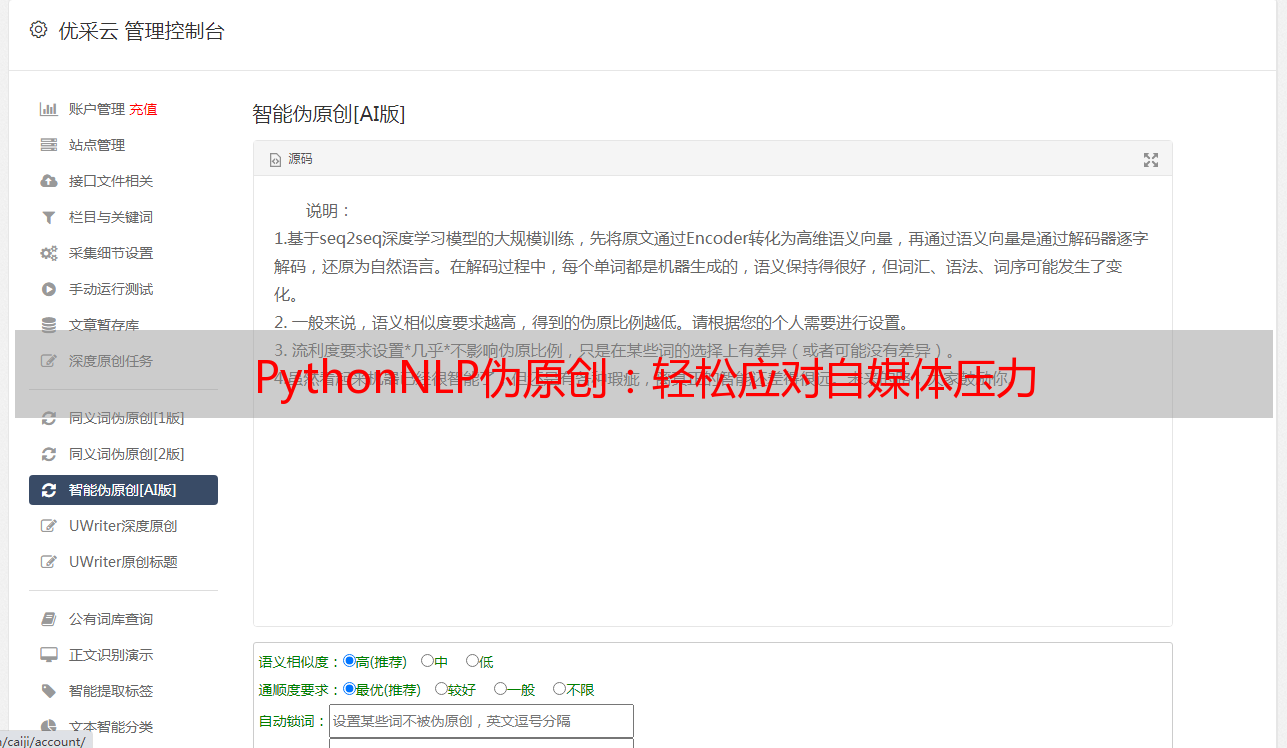 4.可控性:Python NLP伪原创可以根据用户需求自由调整文章长度、语言风格、关键词密度等参数,让用户完全掌控文章内容。
