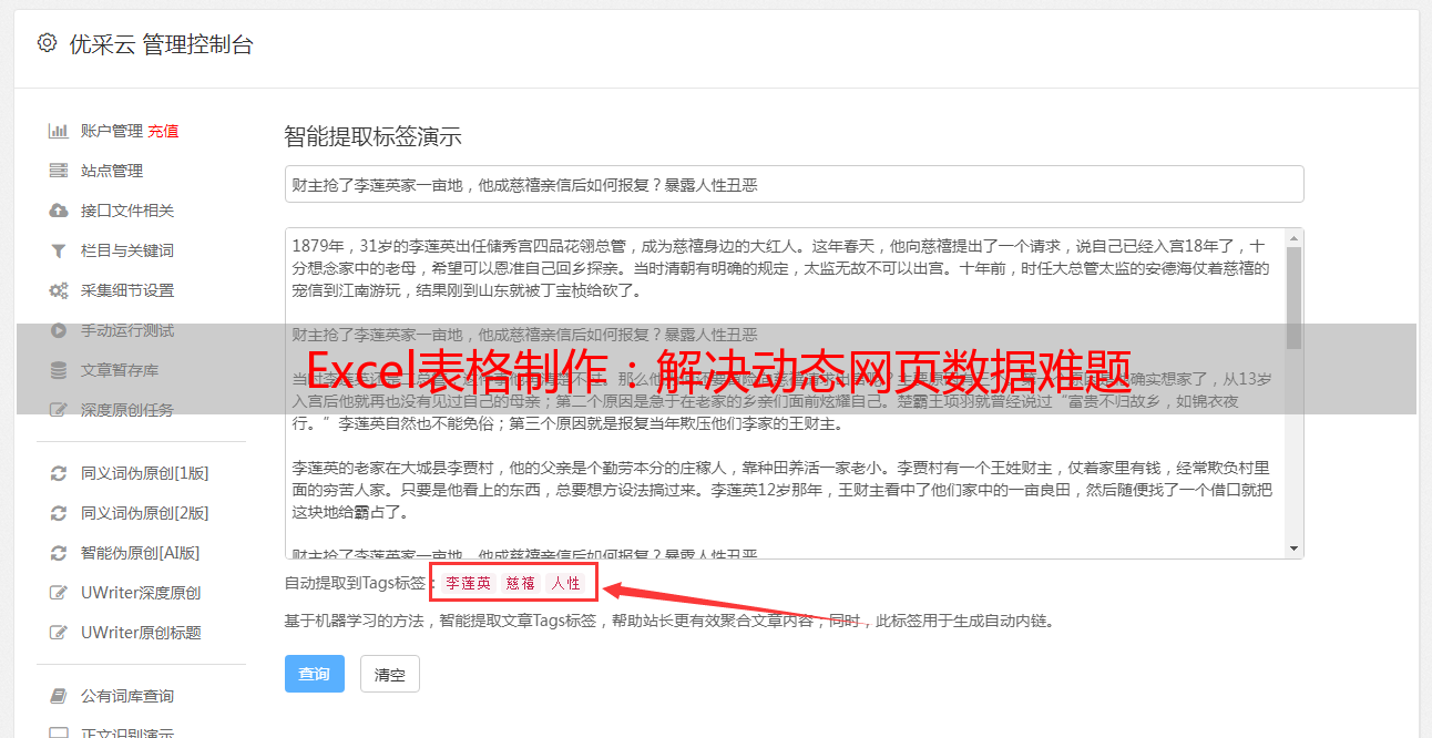 优采云 发布时间: 2023-05-21 00:50Excel表格是我们日常工作中不可或缺的工具,而抓取网页数据是Excel的重要功能之一。但是,在实际应用中,我们会发现Excel无法抓取动态的网页数据。这个问题该怎么解决呢?本文将为大家详细介绍。