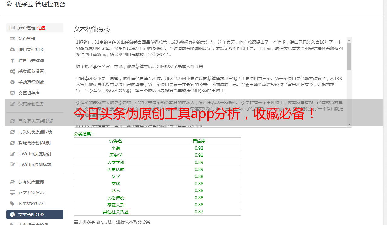 优采云 发布时间: 2023-05-29 00:45作为一名自媒体人,我们都知道,文章是需要不断更新迭代的。然而,每次创作新文章都需要从头开始,这无疑会浪费我们大量的时间和精力。于是,伪原创工具应运而生。今日头条伪原创工具app便是其中之一。它可以帮助我们快速生成一篇与原文相似但又不完全相同的新文章,让我们在不断更新的同时保持文章风格的连贯性。接下来,我们将对今日头条伪原创工具app进行详细分析。