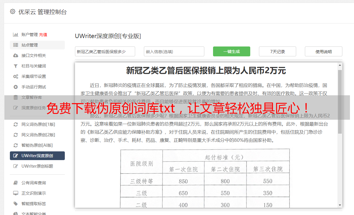 优采云 发布时间: 2023-05-30 02:54伪原创词库txt免费下载,是每一个写手都应该了解的工具。它不仅可以让你的文章更加独特,还可以提高文章的质量和排名。今天,我们就来探讨一下伪原创词库的奥秘。