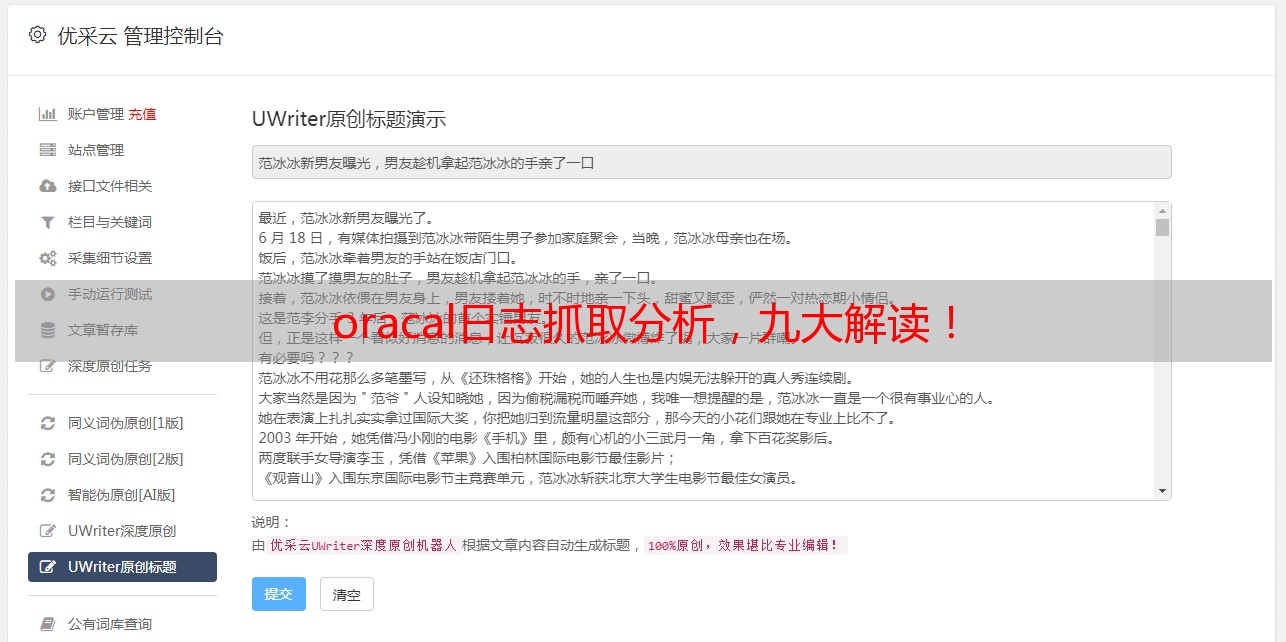 优采云是一家专业的SEO优化公司,提供包括oracal日志抓取分析在内的多种SEO优化服务。通过与优采云合作,用户可以更好地利用oracal日志抓取分析工具,从而提升网站流量和转化率。