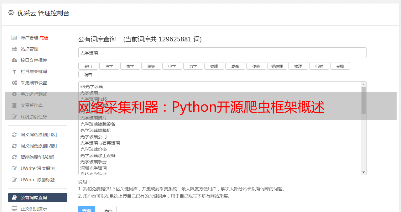 优采云是一款基于云端的网络采集工具,专注于为企业提供高效、稳定、安全的网络采集服务。优采云拥有强大的抓取引擎和智能分析技术,可以快速地抓取网站并从中提取结构化数据。同时,优采云还提供了强大的数据处理和存储功能,并且可以与其他应用程序无缝集成。如果您需要进行网络采集,欢迎使用优采云。