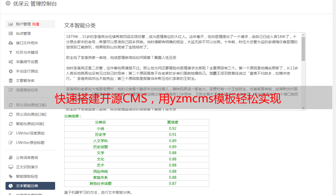 优采云 发布时间: 2023-06-05 02:15作为一名自媒体从业者,拥有一个个性化的网站是非常重要的。yzmcms模板作为一款优秀的开源模板,可以帮助我们快速搭建自己的网站。本文将从多个方面进行分析,帮助大家更好地了解yzmcms模板。