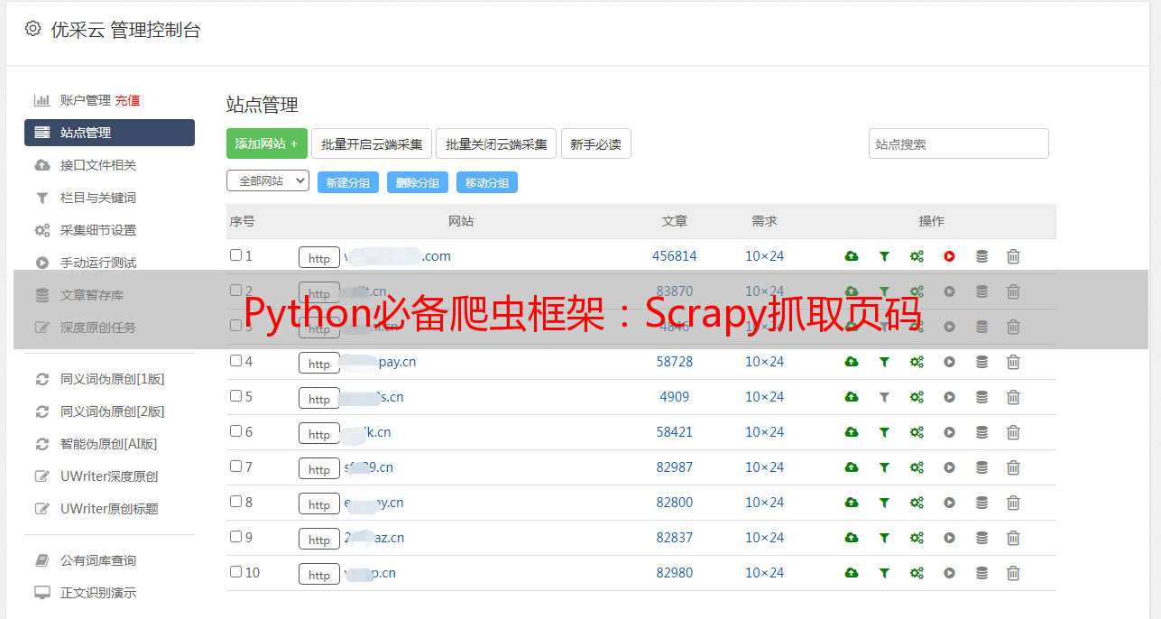 优采云 发布时间: 2023-06-13 05:40在互联网时代,数据是最宝贵的资源之一。而如何获取数据,成为了许多企业和个人的追求。在这样的背景下,爬虫技术应运而生。而scrapy作为Python中最为流行的爬虫框架之一Python必备爬虫框架:Scrapy抓取页码,其抓取页码的技术也备受关注。本文将从10个方面对scrapy抓取页码进行详细分析,帮助大家打造高效的爬虫。
