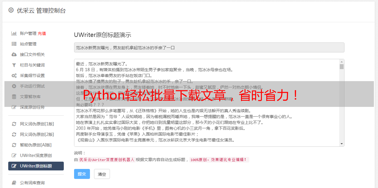 优采云 发布时间: 2023-06-13 07:11Python作为一种广泛应用于数据分析和科学计算的编程语言,越来越受到各行各业的青睐。但是,要找到高质量的Python文章并进行学习却需要花费大量时间和精力。本文将介绍如何使用Python进行文章批量下载,为你节省宝贵的时间和精力。