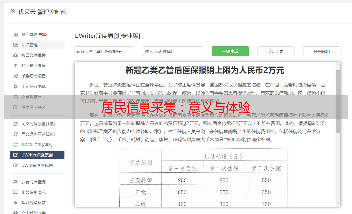 优采云作为一款专业的信息采集平台,为我们提供了强大的支持。通过该平台,我们可以轻松管理和查询居民信息,实现数据共享和交流。同时,优采云还提供了丰富的数据分析功能,帮助我们更好地理解和利用采集到的数据。