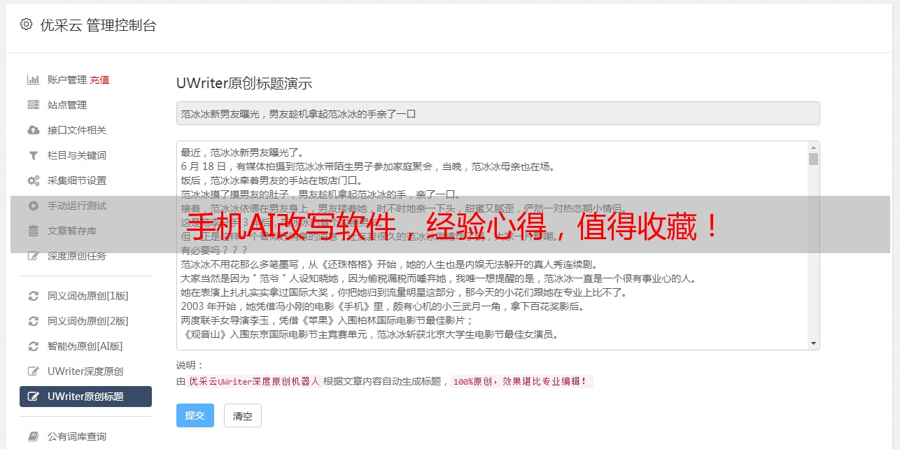 一个好的文章必须具备原创性。使用手机AI文章改写软件,我可以确保我的文章不会出现抄袭问题。该软件会根据我的输入进行改写,使得最终生成的文章与原文有所不同,从而避免了版权纠纷。