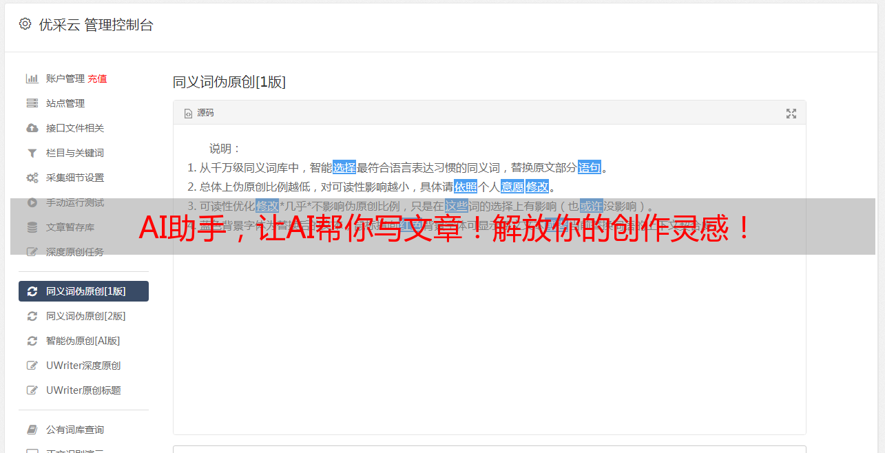 在这个信息爆炸的时代,AI帮忙写文章已经成为越来越多人的选择。无论是为了应付工作任务还是追求个人兴趣,AI都能为你提供强大的支持和帮助。快来尝试一下吧!优采云,SEO优化,请访问www.ucaiyun.com获取更多信息。让AI成为你创作的得力助手!