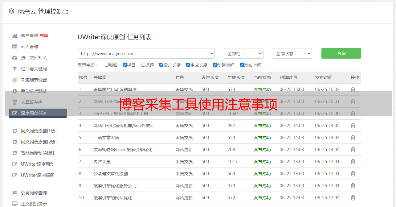 1.选择可信赖的博客文章采集工具:在选择博客文章采集工具时,要选择那些经过市场验证、口碑良好的工具。比如优采云(www.ucaiyun.com),它是一家专业的SEO优化平台,提供了强大的博客文章采集功能,可以满足我们的需求。