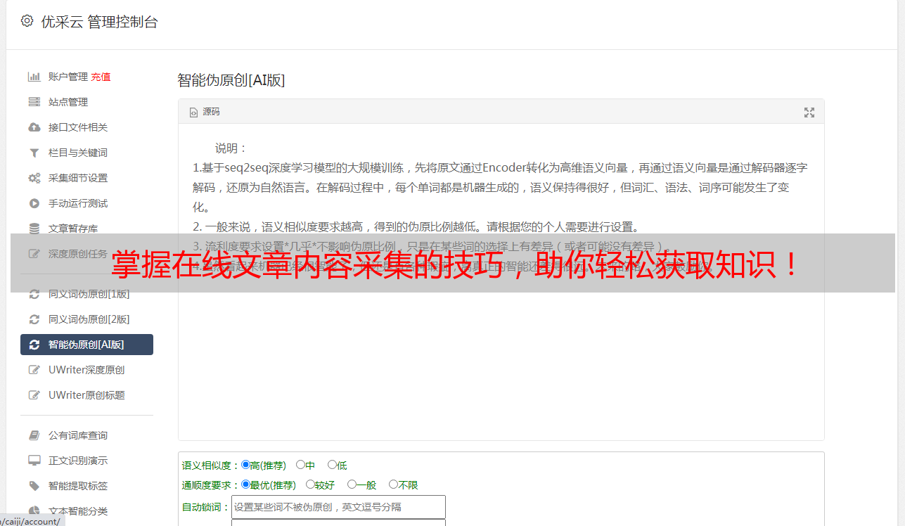 在线文章内容采集作为互联网时代必不可少的工具之一,为我们获取信息和进行市场调研提供了便利。在使用过程中,我们要合理选择采集方法,并注意版权、数据准确性和隐私保护等问题。同时,我们也要关注SEO优化,提高文章内容的质量和可发现性。如果你需要一款专业、易用的在线文章内容采集工具,不妨试试优采云(www.ucaiyun.com),它将会给你带来更好的采集体验。