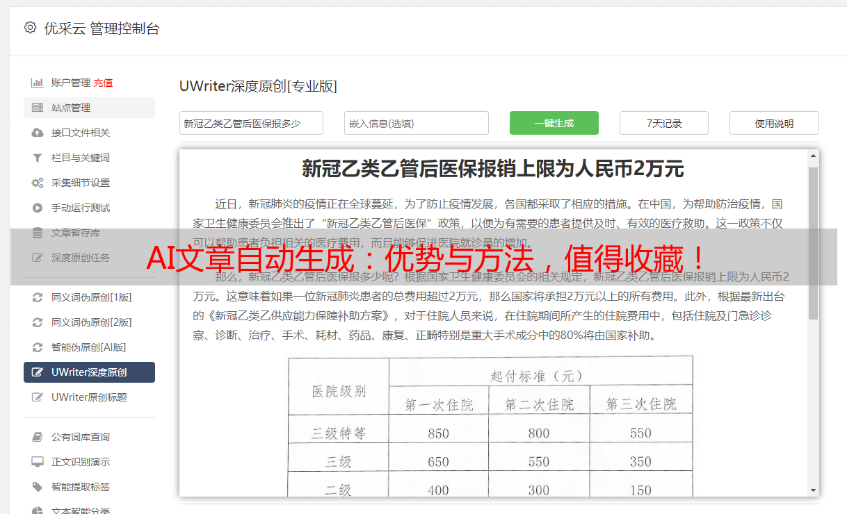 以优采云为例,该公司开发了一款名为UWriter的AI文章自动生成应用。这款应用利用先进的自然语言处理技术和机器学习算法,可以生成高质量、吸引人的文章。通过使用UWriter,用户可以轻松撰写知乎风格的文章,并实现SEO优化,提升文章在搜索引擎上的排名。对于那些需要频繁发布文章并追求高质量和效率的写作者来说,UWriter是一个强大而实用的工具。