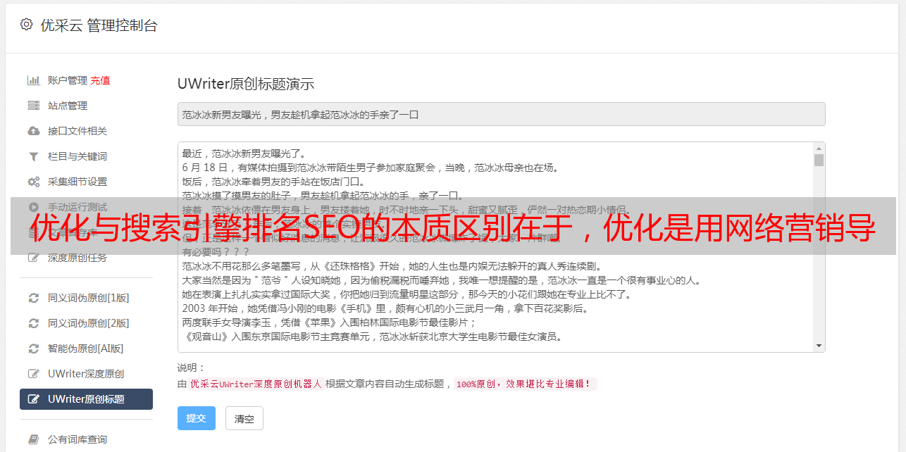 优采云 发布时间: 2021-06-16 00:06优化与搜索引擎排名SEO的本质区别在于,优化是用网络营销导向的建设思想来指导基本要素