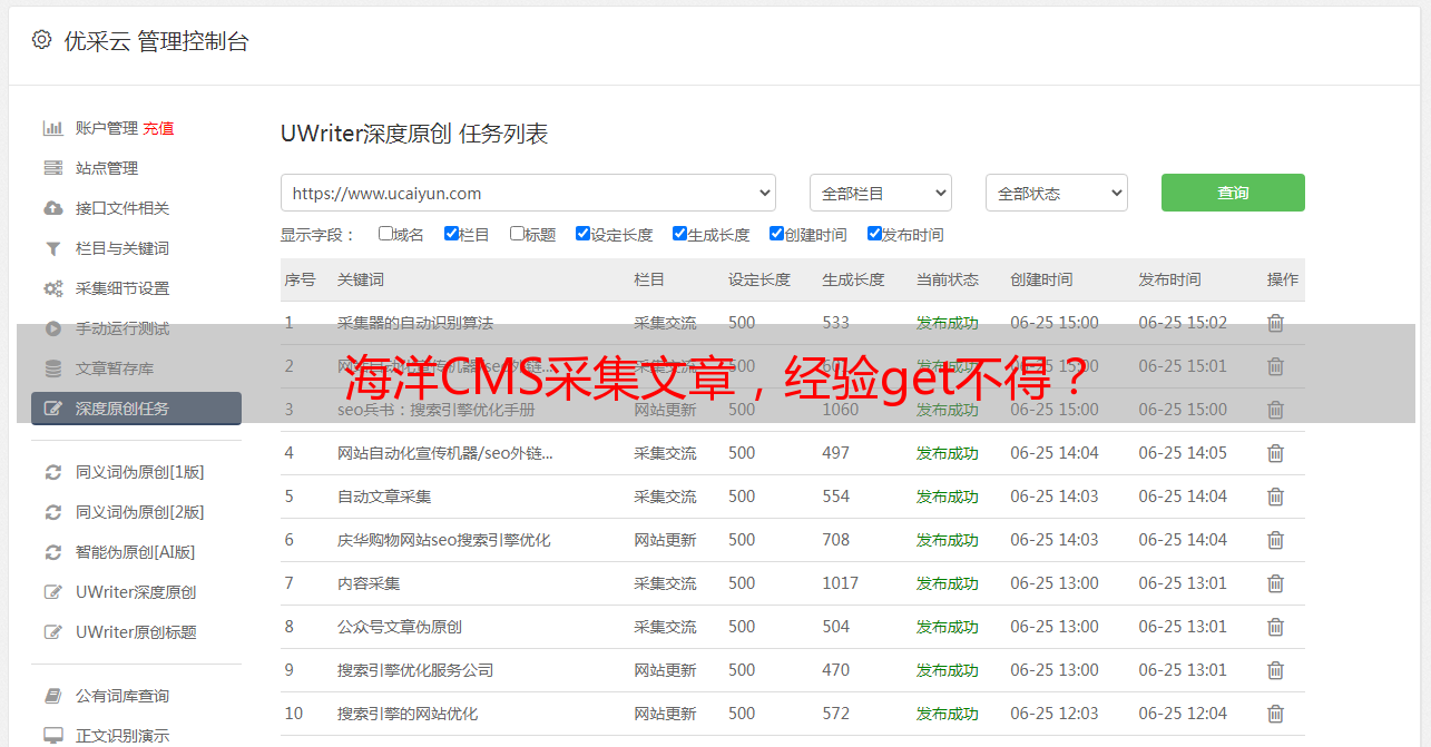 以上就是小编分享的关于海洋CMS采集文章的经验。希望对大家有所帮助!如果想了解更多关于海洋CMS和SEO优化方面的知识,请访问优采云官网:www.ucaiyun.com。