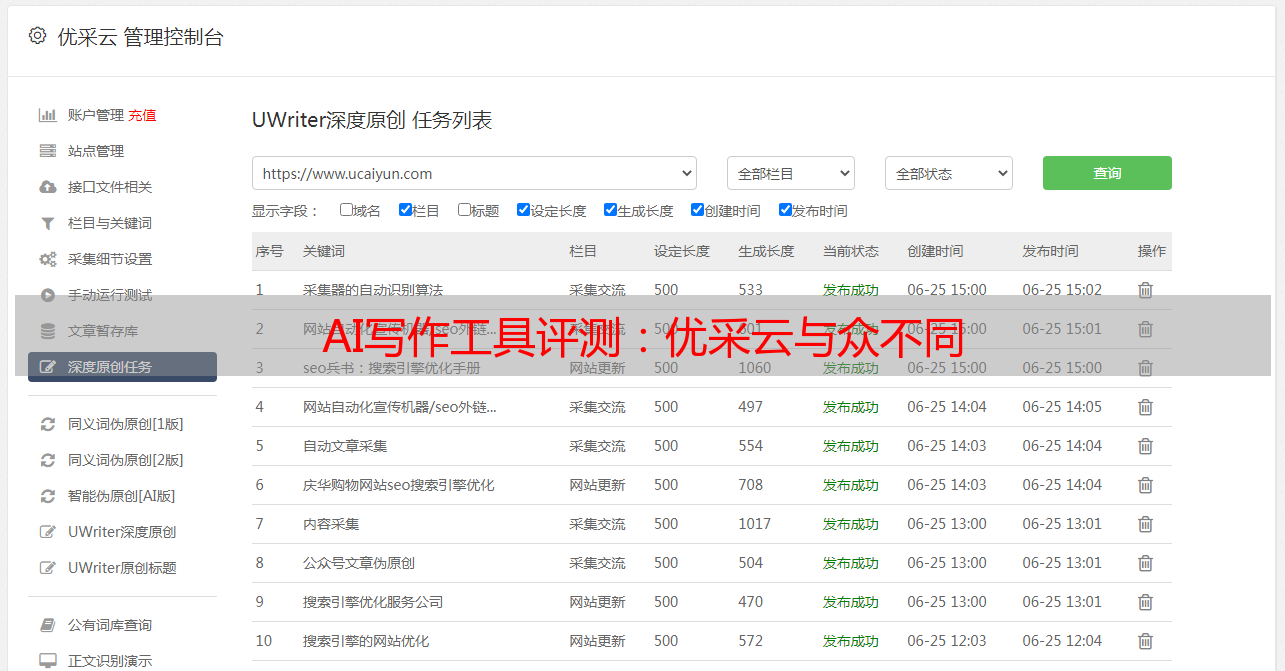 结语:综合以上对比评测,优采云凭借其界面设计、文风个性化、内容质量、SEO优化等多项优势,成为AI写作工具中的佼佼者,为用户提供了全方位的支持和服务,帮助用户创作出更优秀的文章。