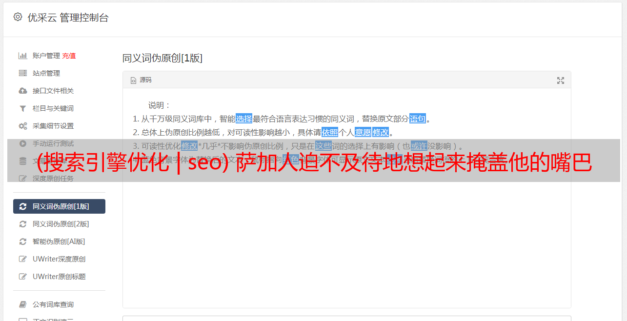 优采云 发布时间: 2021-06-16 03:08(搜索引擎优化 | seo) 萨加人迫不及待地想起来掩盖他的嘴巴